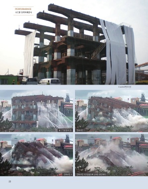 PERFORMANCE 구조물 발파해체공사 Crusher(발파 전) 살수작업(발파 전) 연속사진 1 연속사진 2 연속사진 3(고압살수로 신속한 분진제어) 22